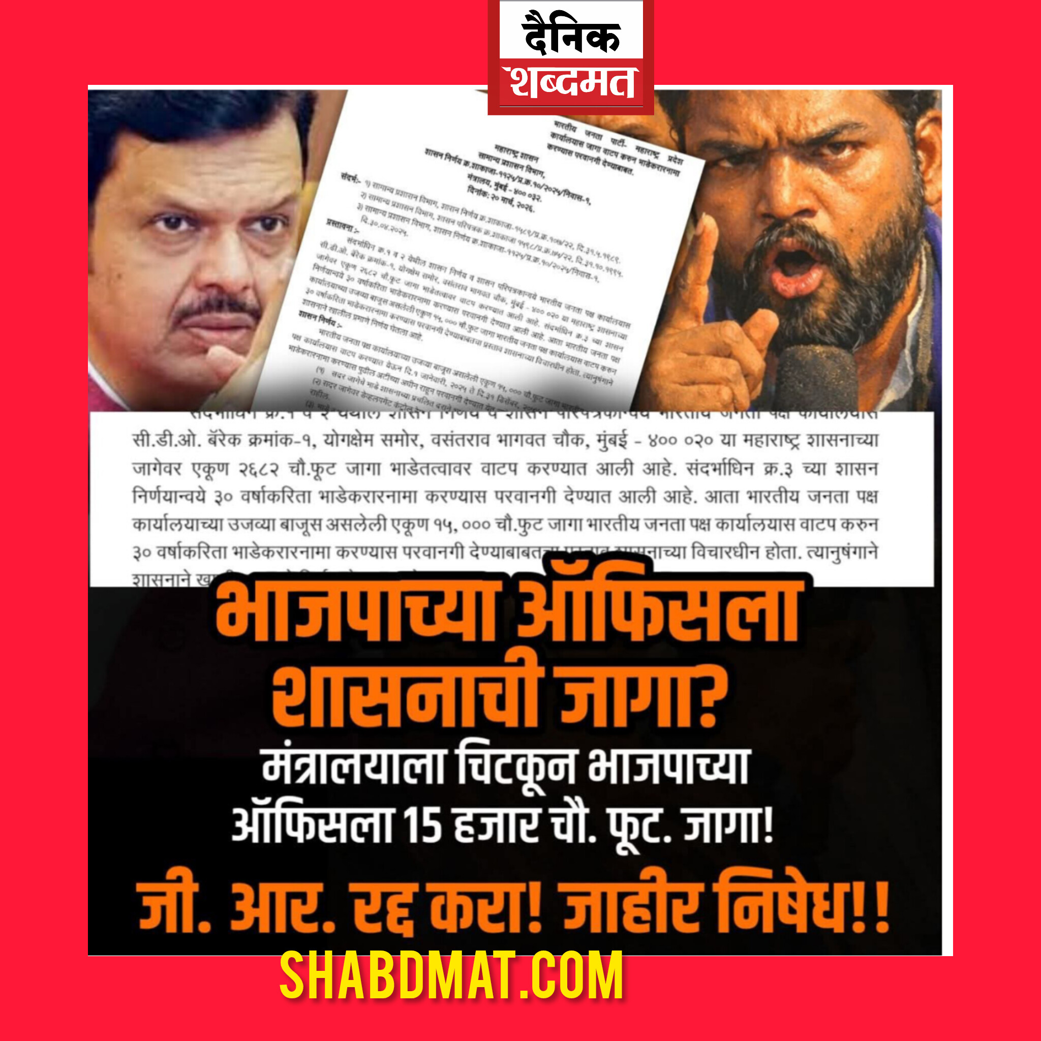 मंत्रालयाच्या बाजूला महाराष्ट्र शासनाच्या जागेवर भारतीय जनता पार्टीला पंधरा हजार चौरस फूट जागा ऑफिस साठी देणारा जीआर रात्री जाहीर करण्यात आलेला आहे, हे